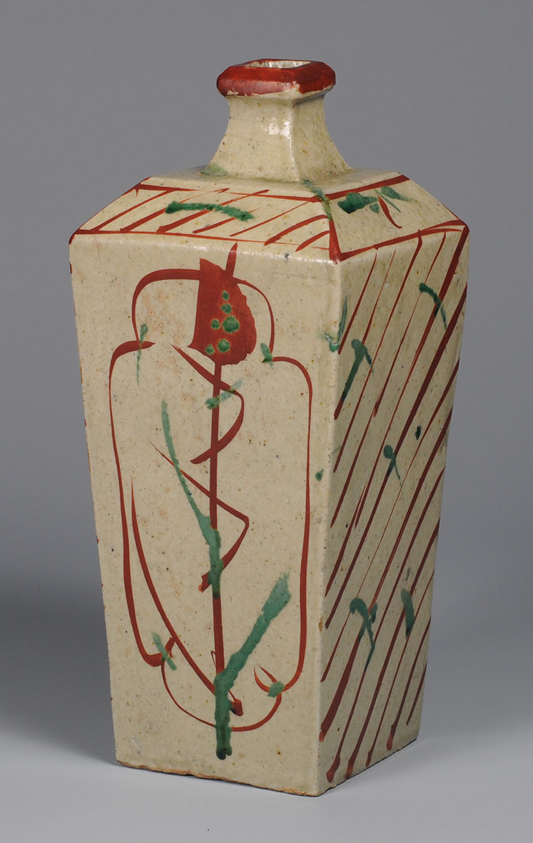 河井寬次郎(かわいかんじろう)は、柳宗悦・濱田庄司とともに民藝運動を主導した陶芸家です。昭和戦前期以降、河井は褐色の鉄絵、赤紫色の辰砂(しんしゃ)・青い染付の顔料を用い、伸びやかな筆致で草花文を器に描きました。