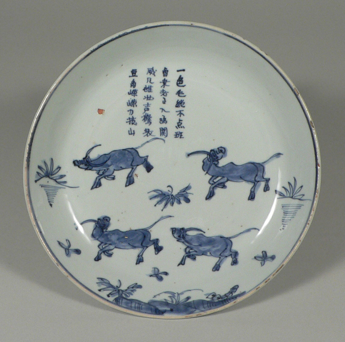コバルトを含んだ青く発色する顔料を用い、軽妙な筆致で放牧された水牛が愛らしく描かれています。牧牛図は中国や日本の水墨画にも描かれた画題であり、画面上部には水墨画と同様に漢詩が添えられています。