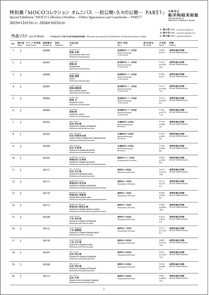 우미노 노부요시 씨가 기증한 컬렉션 가운데, 중국의 묘실을 장식했던 한나라에서 당나라 시대에 이르는 용(俑)과 명기(明器) 20점을 소개한다.