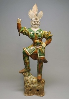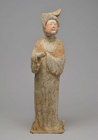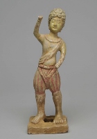 人俑頭髮捲曲、粗眉大眼,據信是東南亞人的樣貌。唐代都城長安為當時頂尖的國際都市,來自東西方的人們與物品在此交流匯聚。當時的人俑亦曾取材粟特人、阿拉伯人等來自西方的所謂胡人,以及非洲和東南亞的黑人等。人俑下身著紅白條紋的短褲,肩上斜掛披帶,足部赤裸粗糙,應是當時貴族宅邸中買進的外國奴隸。右手高舉,一說是正在表演雜技之姿態,然仍未有定論。陝西省禮泉縣鄭仁泰墓(664年)中曾出土類似作品。充滿異國情調和躍動感的造型,完美地反映出唐代國際化的特色。