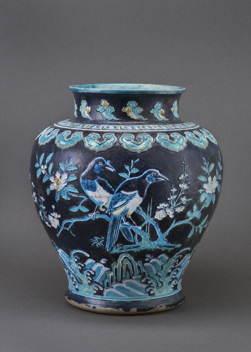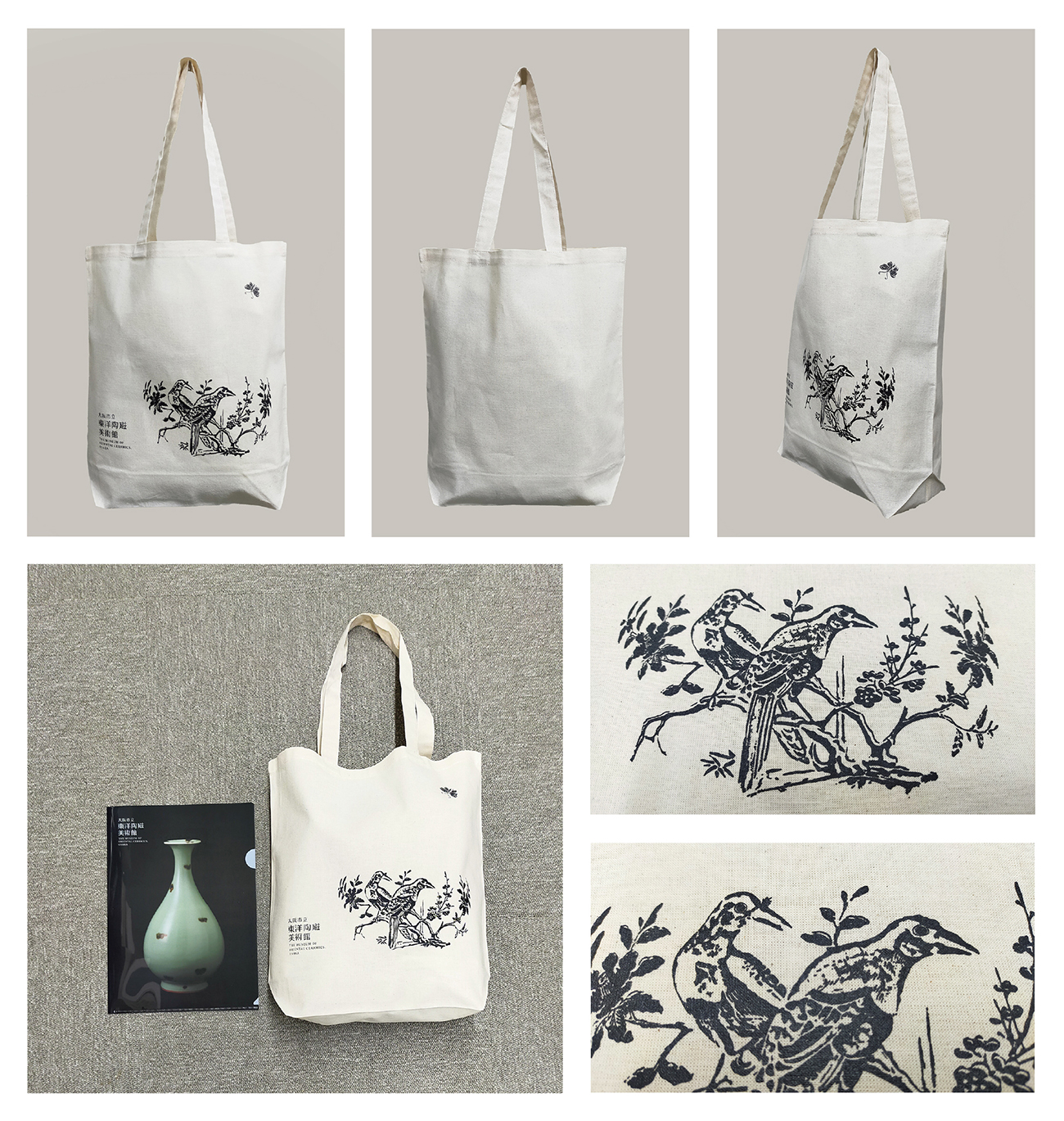 本作は、花樹に止まるつがいの叭々鳥(ははちょう)と鸚哥(いんこ)が浮き彫り風に生き生きと描かれており、その間には蝶が舞い、華やかで優美な雰囲気をまとっています。作品が醸し出す上品な雰囲気をコットンバッグにデザインし、作品の世界観がそっと日常に寄り添うように表現しました。壺に描かれた自然のリズムと生命の息づかいを感じていただけたら幸いです。